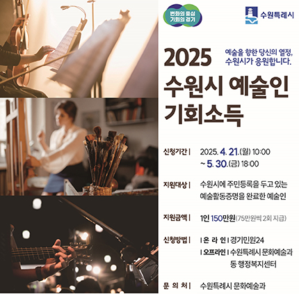 신청 조건은 ▲2025년 4월 21일 현재 수원시에 주민등록 ▲한국예술인복지재단에서 발급한, 유효한 ‘예술활동증명서’ 소지 ▲2025년 기준 중위소득 120% 이하의 개인소득 인정액 등이다.
