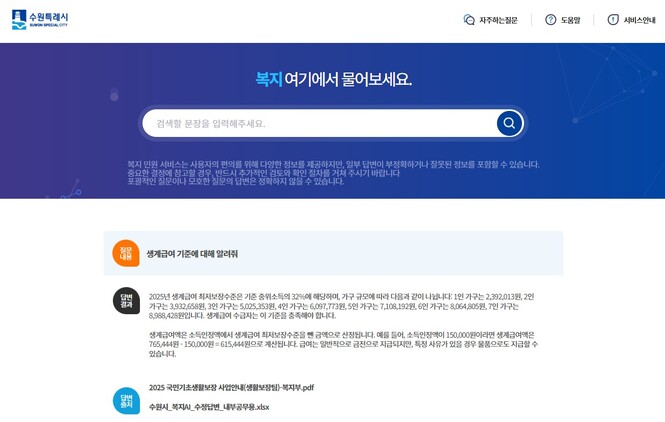 (경기=NSP통신) 조현철 기자 = 경기 수원시(시장 이재준)가 정책 변경이 많은 복지 분야 업무 담당자가 업무를 쉽게 찾아볼 수 있도록 인공지능(AI) 기술을 활용한 복지 업무 프로그램을 구축했다.
