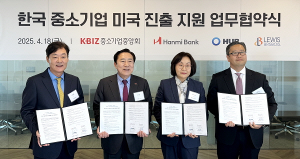 (경북=NSP통신) 김대원 기자 = 중소기업중앙회(회장 김기문)는 지난 18일(현지 시간) 미국 LA에 소재한 한미은행 본점에서 한미은행, 허브천하, LBBS(Lewis Brisbois Bisgaard & Smith LLP) 로펌과 함께 한국 중소기업의 수출입 및 해외 진출 지원을 위한 업무협약을 체결했다.