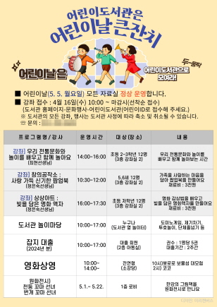 이 외에도 도서관 1층 로비에서는 노벨문학상을 받은 작가 한강의 그림책 ‘천둥 꼬마 선녀 번개 꼬마 선녀’ 전시가 진행되며 어린이날을 축하하는 포토존을 운영할 예정이다. 3층 소극장에서는 오전 10시와 오후 2시에 어린이도서관 상영작 중 인기 있었던 영화를 상영하여 풍성한 볼거리를 제공할 예정이다.