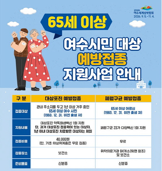 (전남=NSP통신) 서순곤 기자 = 여수시가 65세 이상(1960년 12월 31일 이전 출생자) 여수 시민을 대상으로 폐렴구균 및 대상포진 예방접종 비용을 연중 지원한다.