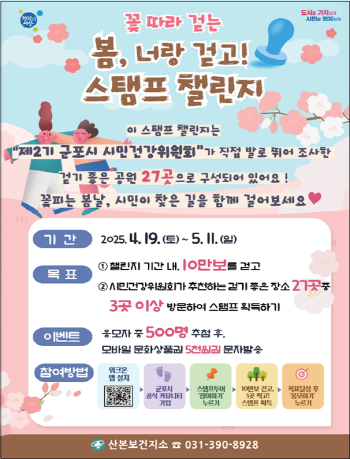 (경기=NSP통신) 정희순 기자 = 경기 군포시 산본보건지소는 철쭉축제가 한창인 지난 19일부터 5월 11일까지 시민들의 걷기 실천을 장려하고 지역 명소를 함께 즐길 수 있는 ‘꽃 따라 걷는 봄, 너랑 걷고!’ 스탬프 챌린지를 운영 중이다.