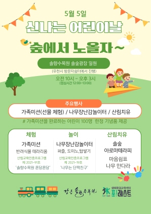 (강원=NSP통신) 조이호 기자 = 강원 강릉(시장 김홍규) 강릉솔향수목원은 오는 5월 5일 어린이날을 맞아 ‘신나는 어린이날, 숲에서 노올자’ 행사를 개최한다.