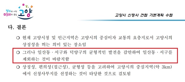 또 실제 고양시장 재임 당시 지나친 덕양구 위주의 행정으로 고양시장이 아니라 덕양시장이라는 별칭을 얻은 이재준 전 고양시장 당시 시가 발주한 ‘고양시 신청사 건립 기본계획 수립’ 용역 보고서 92p 결론에는 일산동·서구와 덕양구의 균형적인 발전을 감안해 일산동·서구를 신청사 후보지에서 제외하는 것이 바람직하다고 적시돼 있다.