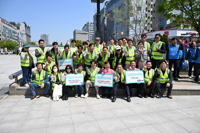 안산국제거리극축제를 앞두고 ‘손님맞이 안산사랑 대청소’ 행사에 참여한 시민, 자원봉사단체, 공공기관 관계자들이 기념촬영을 하고 있다. (사진 = 안산환경재단)