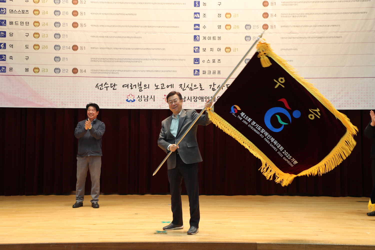 행사에서 신 시장은 장애인체육회 상임부회장으로부터 단기를 이양받고, 종합 우승기와 우승컵 봉납식에 참여하며 성남시의 우수한 경기 성과를 축하했다.