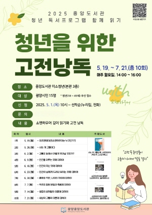 남수향 중앙도서관팀장은 “이번 프로그램은 청년들이 혼자 하는 독서에서 벗어나 서로의 생각을 나누고 연결되는 경험을 통해 독서의 즐거움과 의미를 새롭게 발견할 수 있도록 기획했다”며 “광양시의 많은 청년들이 고전을 매개로 한 깊이 있는 독서 여정에 함께하길 바란다”고 말했다.