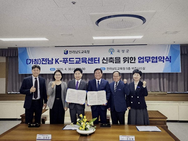 (전남=NSP통신) 김용재 기자 = 곡성군(군수 조상래)과 전남도교육청(교육감 김대중)이 지난달 30일 전남도교육청 비즈니스실에서 (가칭)전남 k-푸드교육센터의 성공적인 신축을 위한 업무협약을 체결했다.