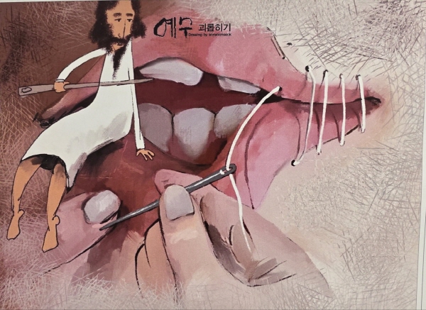 이번 전시는 단순한 종교적 오마주를 넘는다. ‘예수 괴롭히기’라는 도발적인 제목의 일러스트레이션 시리즈는 성역을 해체하며 예수를 현실 속 고통받는 인간의 모습으로 재해석한다.