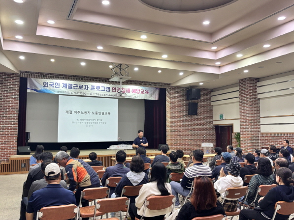 이날 강사로 나선 문길주 전남노동권익센터장은 계절근로자들의 노동 현장에서 발생한 인권 침해 사례를 소개하고 근로기준법 준수, 산업재해보상보험 가입 의무 등 고용주가 반드시 이행해야 할 사항들을 자세히 설명했다.
