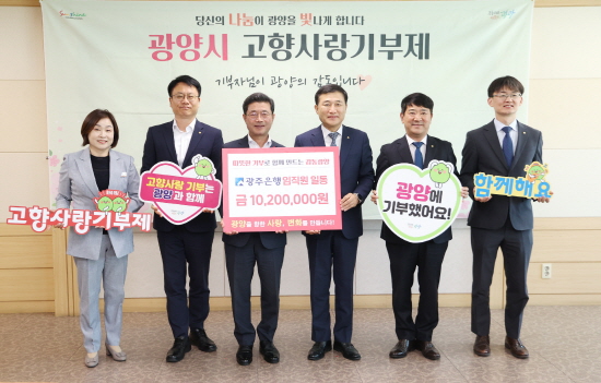 (전남=NSP통신) 김성철 기자 = 광양시는 광주은행 임직원들이 지역과의 상생을 응원하고 건전한 기부 문화 확산을 위해 고향사랑 기부금 1020만 원을 전달했다고 밝혔다.