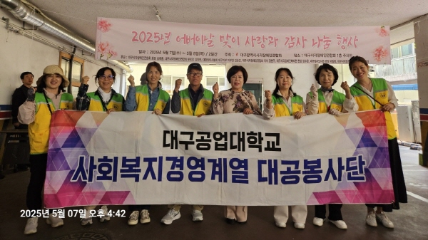 (경북=NSP통신) 김대원 기자 = 대구공업대학교(총장 이별나) 사회복지경영계열 대공봉사단은 지난 7일부터 8일까지 2일간 대구광역시시각장애인연합회에서 주최한 ‘2025년 어버이날 맞아 사랑과 감사의 나눔 행사’에 자원봉사 지원을 했다.
