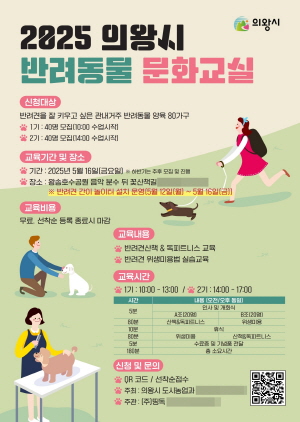 (경기=NSP통신) 김해종 기자 = 경기 의왕시(시장 김성제)는 반려동물과 시민이 함께 건강하고 행복하게 살아가는 반려문화를 조성하기 위해 ‘2025년 상반기 반려동물 문화교실’을 개최한다.