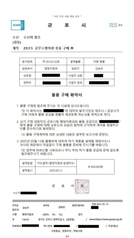 시에 따르면 13일 군포시 공무원을 사칭해 관용차 관련 ‘물품구매 확약서’ 허위 공문을 받았다는 관내 기업체 대표의 제보를 받고 확인한 결과 공문서를 위조한 것으로 확인됐다.
