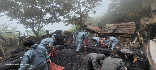 샤롯데 봉사단은 20여 명은 15일 여수시 영취산 도솔암 화재 현장을 찾아 전각 잔해 정리 등 조속한 복구를 위해 힘을 보탰다.