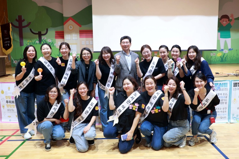 이상일 용인특례시장이 16일 용인한빛초등학교 별빛도서관 축제에서 도서관 어머니회 관계자들과 기념촬영을 하고 있다. (사진 = 용인특례시)