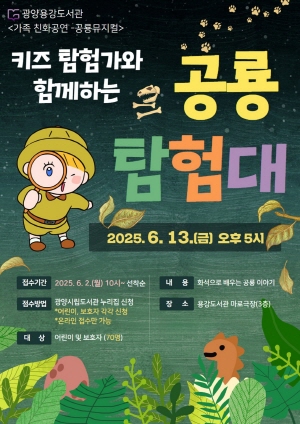 (전남=NSP통신) 김성철 기자 = 광양용강도서관이 오는 6월 13일 오후 5시, 마로극장에서 어린이와 가족 70여 명을 대상으로 교육·참여형 뮤지컬 ‘공룡 탐험대’를 선보인다.