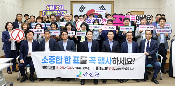 (전남=NSP통신) 김용재 기자 = 강진군이 오는 6월 3일 실시되는 제21대 대통령선거를 앞두고 군민들의 적극적인 투표 참여를 당부했다.