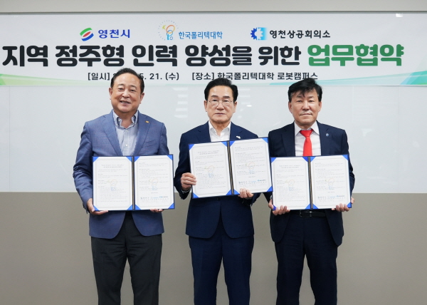 (경북=NSP통신) 김대원 기자 = 영천시는 21일 학교법인 한국폴리텍대학, 영천상공회의소와 함께 3자 업무협약을 체결하고 지역 정주형 인력 양성에 박차를 가할 계획이라고 밝혔다.