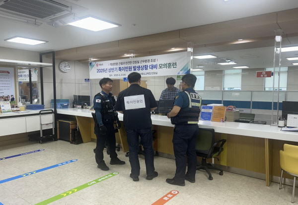 훈련은 단계별 행동 매뉴얼에 따라 진행됐으며 △비상대응팀(현장대처·신고·구호·제압반) 구성 △112 연계 비상벨 작동과 경찰 출동 △민원 공무원 안전장소 대피 △웨어러블캠을 활용한 증거 영상 확보 △경찰에 의한 악성 민원인 제압 △특이 민원 발생 상황 보고 등 실제 상황을 가정한 대응 훈련이 이뤄졌다.