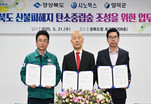 (경북=NSP통신) 조인호 기자 = 경상북도는 21일 경북도청 회의실에서 시노펙스, 영덕군과 함께 ‘산불피해지 탄소중립숲 조성을 위한 업무협약’을 체결했다.