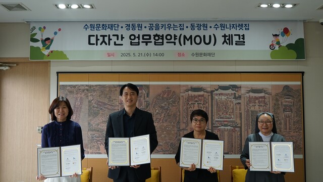 NSP통신-21일 (왼쪽부터) 신증주 경동원 원장, 오영균 수원문화재단 대표, 이옥재 동광원 원장, 정순자 수원나자렛집 원장이 업무협약 후 기념촬영을 하는 모습. (사진 = 수원문화재단)
