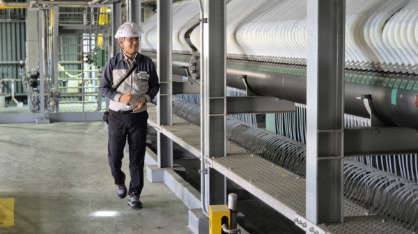 이동영 공장장이 염소와 가성소다 생산시설을 둘러보고 있다. (사진 = 서순곤 기자)