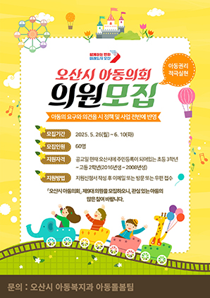 (경기=NSP통신) 조현철 기자 = 경기 오산시(시장 이권재)가 아동의 시정 참여 기회 확대를 위해 제9대 아동의회 위원을 6월 10일까지 공개 모집한다.