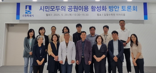 NSP통신-29일 공원 이용 활성화 계획 수립을 위한 토론회 참석자들이 기념촬영을 하는 모습. (사진 = 수원시)