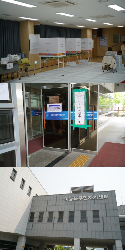 위로부터 사전 투표장의 모습, 이동읍 사전투표장 안내, 처인구 이동읍 주민자치센터. (사진 = 김병관 기자)