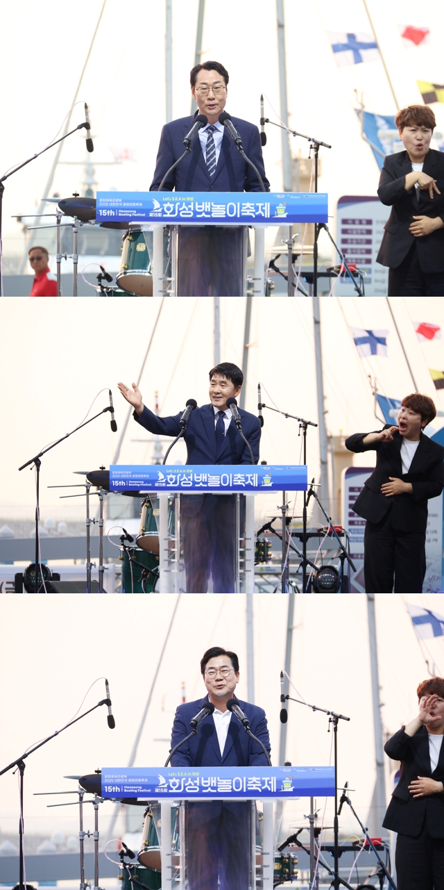 30일 개막한 ‘화성시 뱃놀이 축제’에서 정명근 화성시장(위부터)과 배정수 화성시의회 의장, 박찬대 더불어민주당 원내대표가 축사를 하고 있다. (사진 = 조현철 기자)
