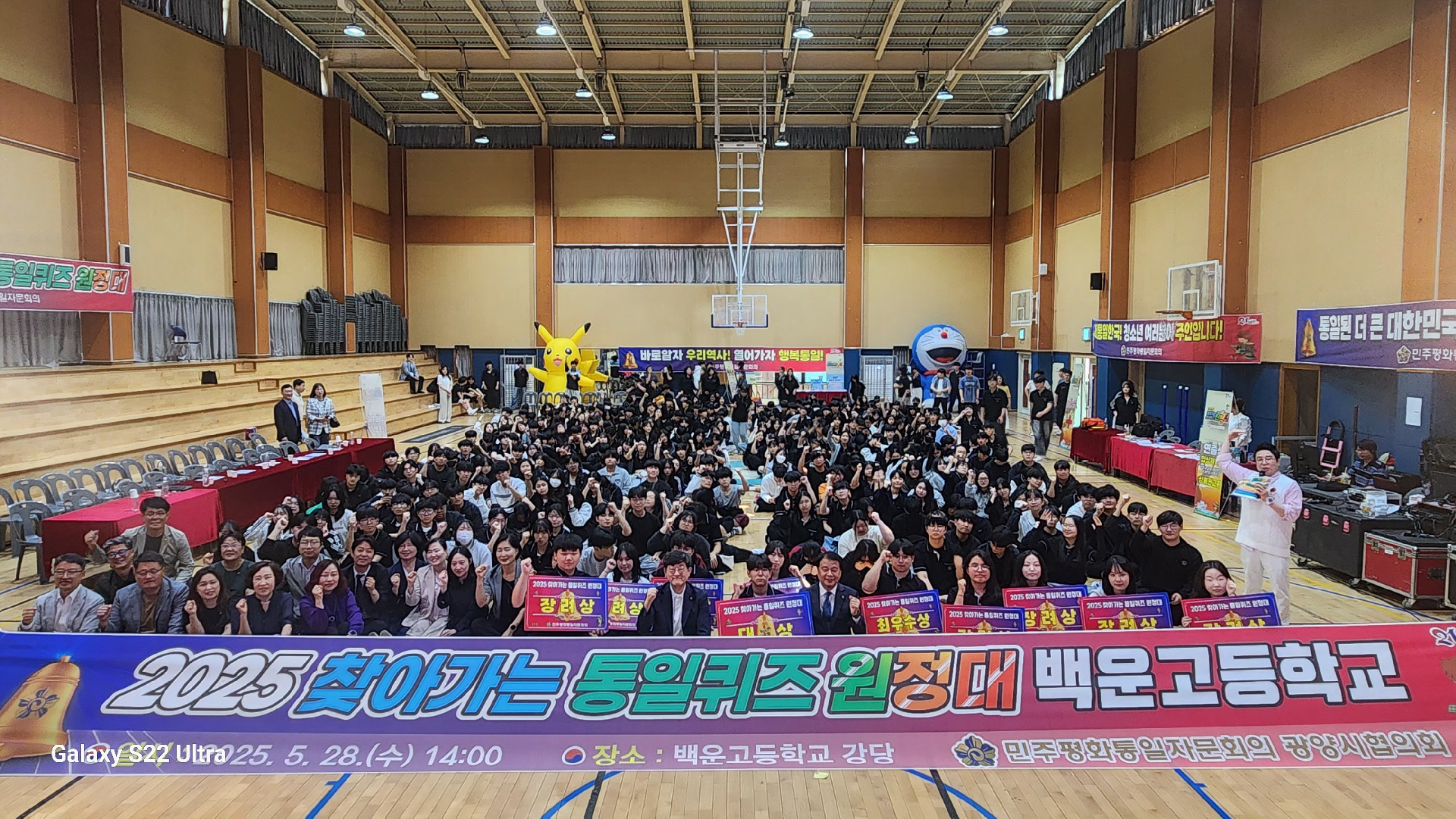 (전남=NSP통신) 김성철 기자 = 민주평화통일자문회의 전남광양시협의회(회장 남기호)는 지난 달 28일 광양백운고등학교 체육관에서 1·2학년 학생 500여 명이 참석한 가운데 ‘2025년 찾아가는 통일퀴즈 원정대-광양백운고편’을 성황리에 개최했다고 밝혔다.