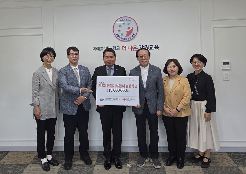 (강원=NSP통신) 조이호 기자 = 강원특별자치도교육청(교육감 신경호)은 지난달 30일 교육감실에서 대한적십자사와 함께 ‘헌혈기부권 나눔장학금’ 전달식을 가졌다.