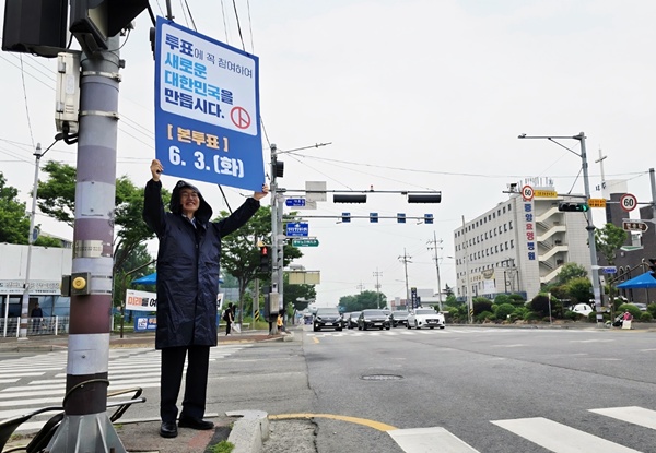 ‘투표에 꼭 참여해 새로운 대한민국을 만듭시다’라고 적힌 피켓을 든 윤 시장은 사거리를 오가는 차량과 시민들에게 투표 행사를 당부했다.