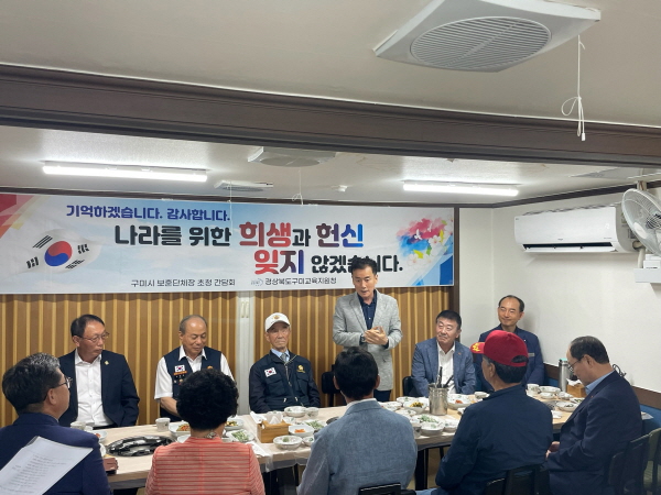 (경북=NSP통신) 김대원 기자 = 경상북도구미교육지원청(교육장 남성관)은 6월 호국보훈의 달을 맞아 2일 특수임무유공자회, 광복회, 상이군경회, 전몰군경유족회, 전몰군경미망인회, 무공수훈자회, 고엽제전우회, 6·25참전유공자회, 월남참전자회 등 총 9개의 보훈단체 지회장들을 초청해 오찬과 함께 간담회 자리를 가졌다.