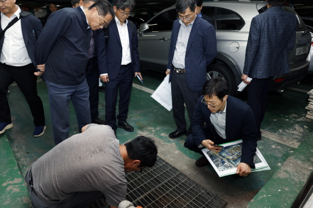 NSP통신-황상하 사장을 비롯한 점검단이 영구임대아파트 배수구를 살펴보고 있다.