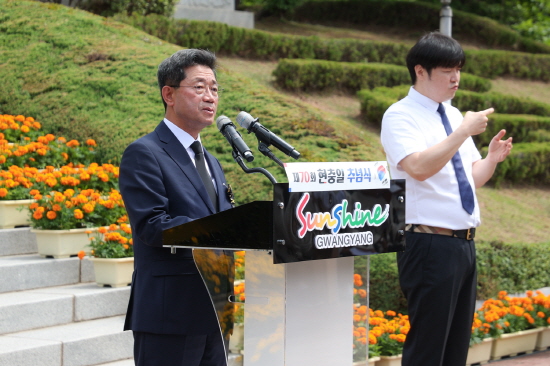 행사는 오전 10시 정각 전국적으로 울린 사이렌에 맞춰 순국선열과 호국영령에 대한 묵념을 시작으로, 국민의례, 헌화 및 분향, 광양시장 추념사, 헌시 낭송 순으로 이어졌으며 마지막으로 참석자 전원이 ‘현충일의 노래’를 함께 제창하며 마무리됐다.