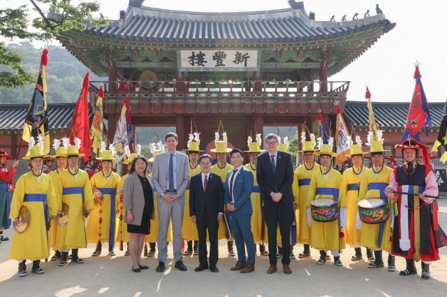 9일 오후 화성행궁에서 김동연 경기도지사와 David Eby BC주 수상이 취타대 공연 관람 후 기념촬영을 하고 있다. (사진 = 경기도)
