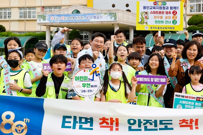 이날 마북초등학교에서 진행된 ‘안전한 등굣길을 위한 3가지 약속 멈추GO 살피GO 건너GO’ 교통안전 캠페인에는 이상일 시장과 시 관계자, 김희정 용인교육지원청 교육장과 마북초등학교 학생·학부모, 학교 관계자, 용인서부경찰서 관계자, 용인서부녹색어머니회 회원 등 약 100여 명이 참여했다.