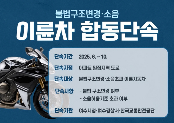 여수시 관계자는 “위반 사항이 적발되면 예외 없이 법적 조치를 취할 예정”이라며 “배달 대행업체 등 이륜차 운전자들은 저소음 운행과 법규 준수에 적극 동참해 주길 바란다”고 말했다.
