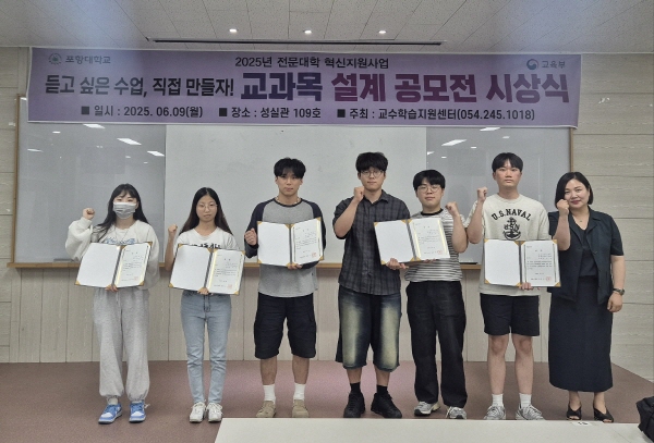 (경북=NSP통신) 조인호 기자 = 포항대학교(총장 하민영) 교수학습지원센터는 지난 9일 성실관 세미나실에서 ‘2025학년도 교과목 설계 공모전 시상식’을 개최했다.