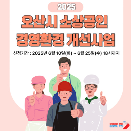 (경기=NSP통신) 조현철 기자 = 경기 오산시(시장 이권재)가 지역내 소상공인의 안정적인 경영 기반 조성과 사업 경쟁력 강화를 위해 ‘2025년 오산시 소상공인 경영환경개선사업’ 참여자를 오는 25일까지 모집한다.