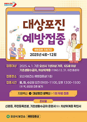 (경기=NSP통신) 조현철 기자 = 경기 오산시(시장 이권재)가 의료취약계층의 건강 보호와 질병 예방을 위해 대상포진 예방접종 지원 대상을 기존 75세 이상에서 65세 이상으로 확대한다.
