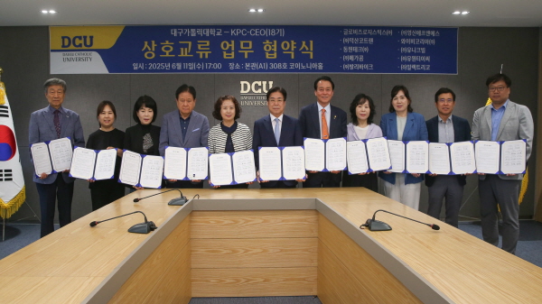 (경북=NSP통신) 김대원 기자 = 대구가톨릭대학교(총장 성한기)는 지난 11일 지역 산업 발전과 인재 양성을 위해 KPC-CEO(18기) 회원사 10개 기업과 산학협력을 위한 상호교류 업무협약을 체결했다.