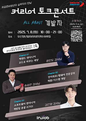 토크콘서트는 7월 8일 오후 6시부터 오산시 운천로 일원 ‘이루잡’에서 개최되며 백엔드 엔지니어, 제품·시스템 개발자, 소프트웨어 엔지니어 등 IT 분야의 현직자 3인이 패널로 참여해 실무 중심의 생생한 취업 정보를 전달할 예정이다.