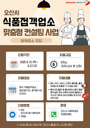 (경기=NSP통신) 조현철 기자 = 경기 오산시(시장 이권재)가 지역내 식품접객업소의 지속 가능한 성장과 경쟁력 강화를 위해 ‘2025년 식품접객업소 맞춤형 컨설팅 사업’ 참여 업소를 오는 27일까지 모집한다.