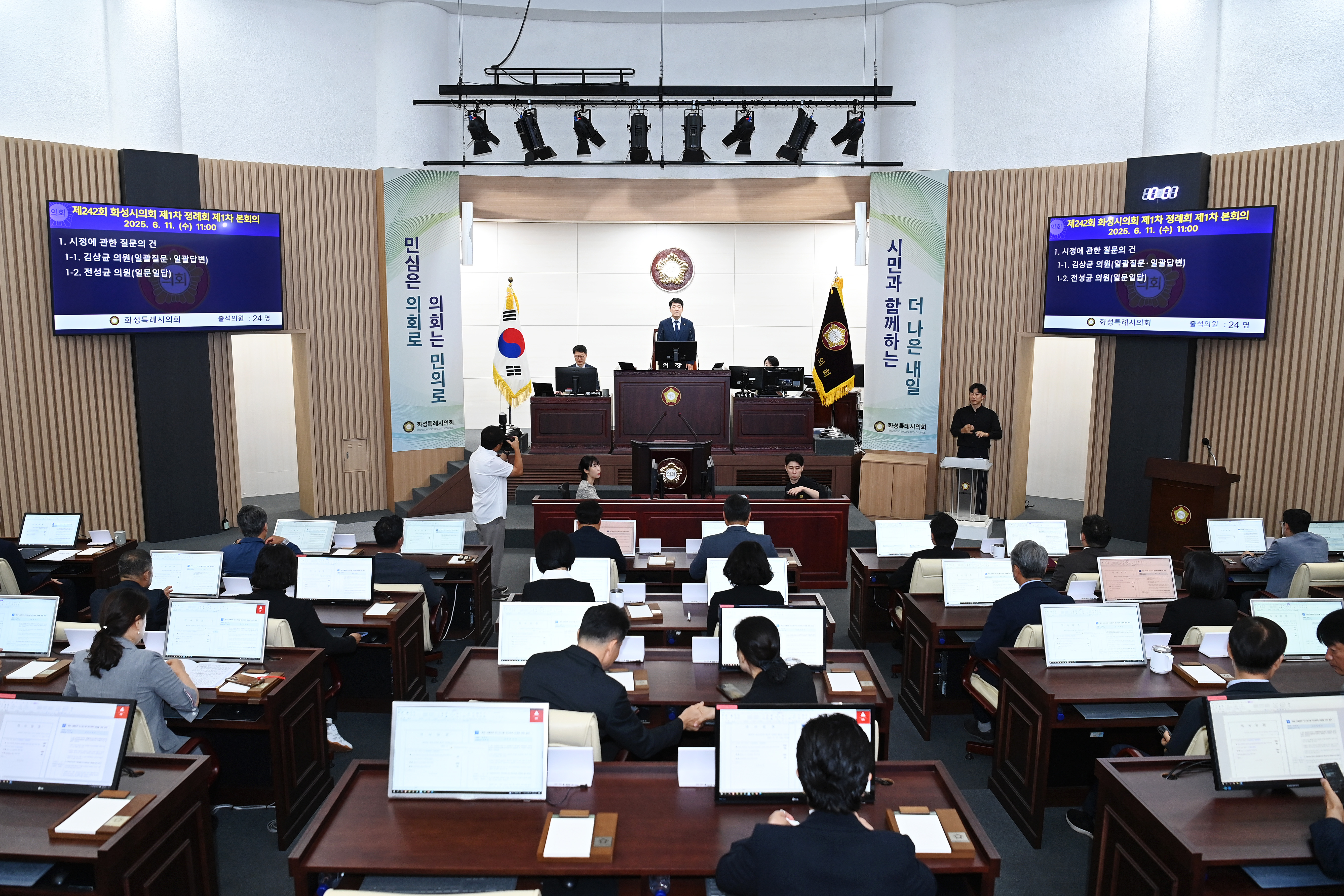 (경기=NSP통신) 조현철 기자 = 경기 화성시의회(의장 배정수)가 17일 제242회 1차 정례회 제2차 본회의를 개의하고 5분 발언과 시정질문을 이어갔다.