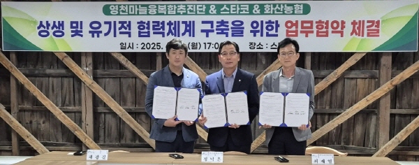 (경북=NSP통신) 김대원 기자 = 영천시(시장 최기문)는 지난 16일 영천마늘농촌융복합사업추진단(단장 최재열), 화산농업협동조합(조합장 정낙온), 지역사회협동조합 스타코(이사장 채광길)가 영천마늘 산업의 지속가능한 발전과 지역경제 활성화를 위해 3자간 업무협약을 체결했다고 밝혔다.