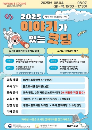 (전남=NSP통신) 김성철 기자 = 광양금호도서관은 국립어린이청소년도서관이 주관한 공모사업에 선정돼, 여름방학 기간에 지역 초등학생을 대상으로 독서 연계형 코딩 강좌를 운영한다고 밝혔다.