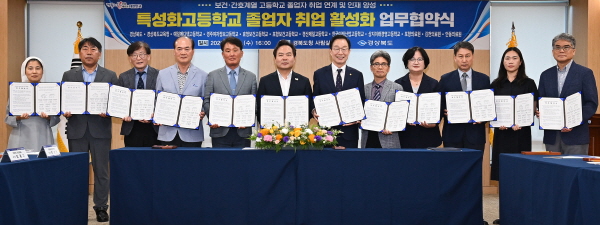 (경북=NSP통신) 조인호 기자 = 경상북도는 18일 경북도청에서 경북도와 경북교육청, 도내 7개 보건·간호계열 특성화고등학교, 3개 지방의료원이 고등학교 졸업자 채용 활성화를 목표로 업무협약을 체결했다.